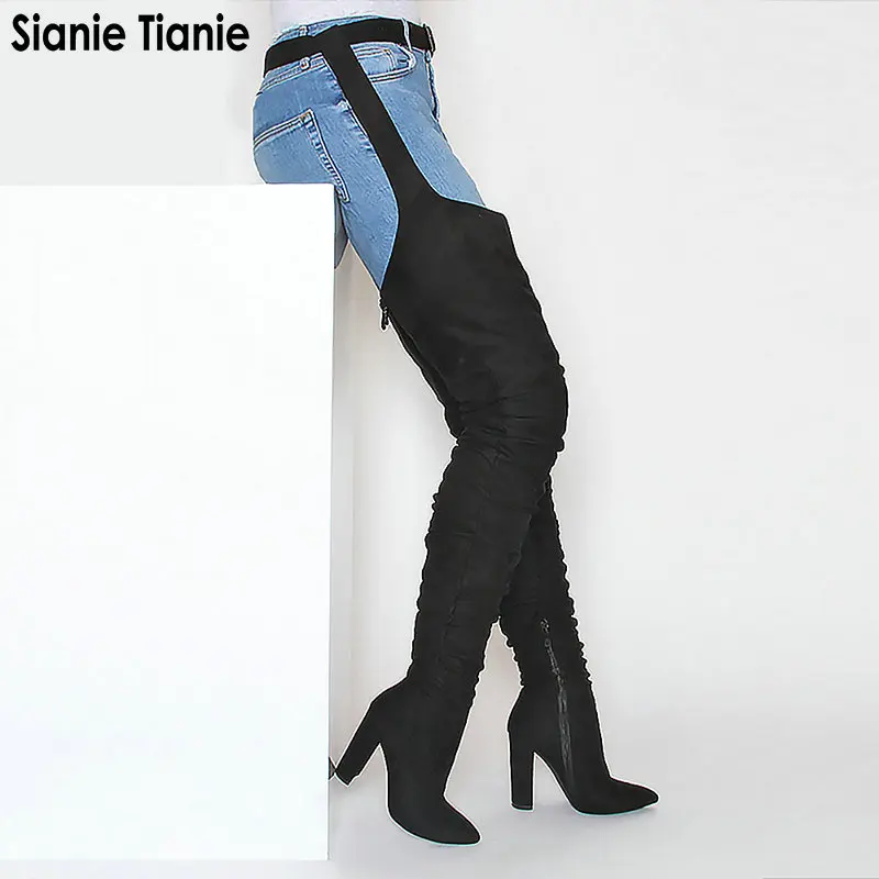 Beste Koop Sianie Tianie Rihanna Stijl Hoge Hakken Winter Schoenen Vrouw Over De Knie Dij Hoge Laars Taille Gesp Vrouwen Overknee laarzen Goedkoop